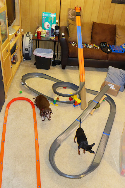 Obviously, this is just the Crash Racer's track portion of the setup. The next step will be figuring out what angles the orange Hot Wheels track straight sections will need and how high the entire setup will be when completed.